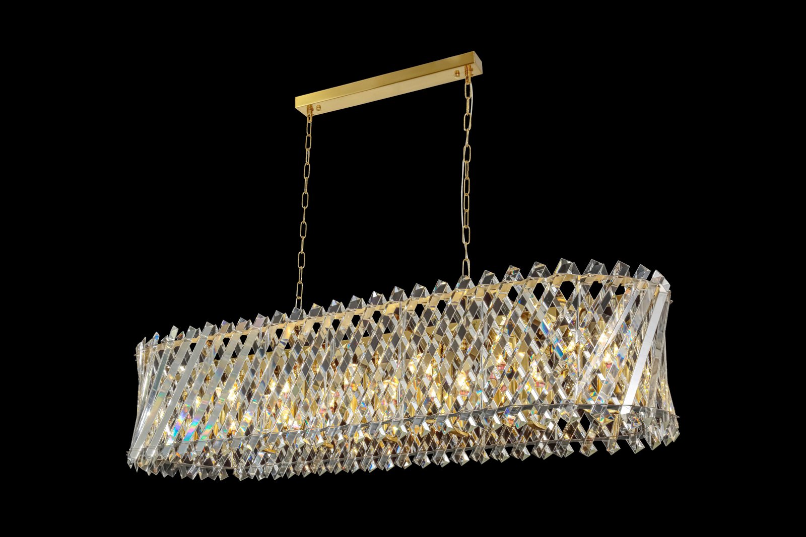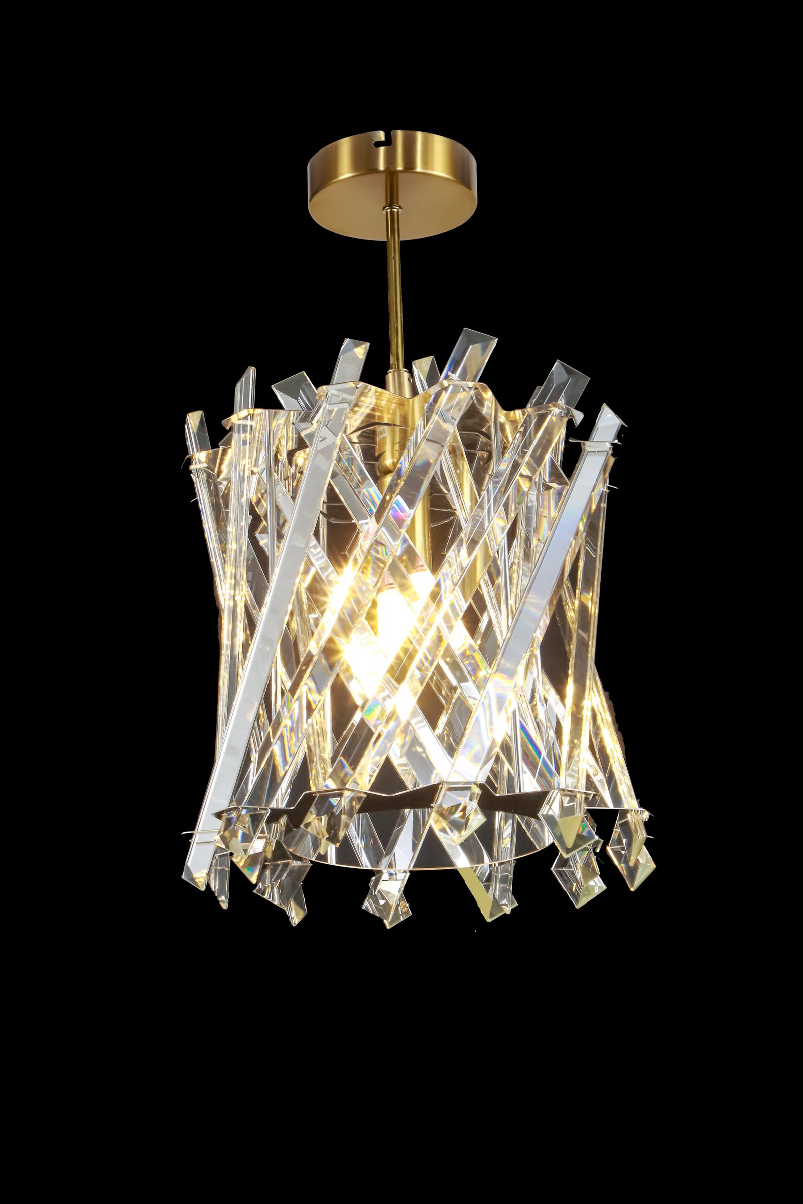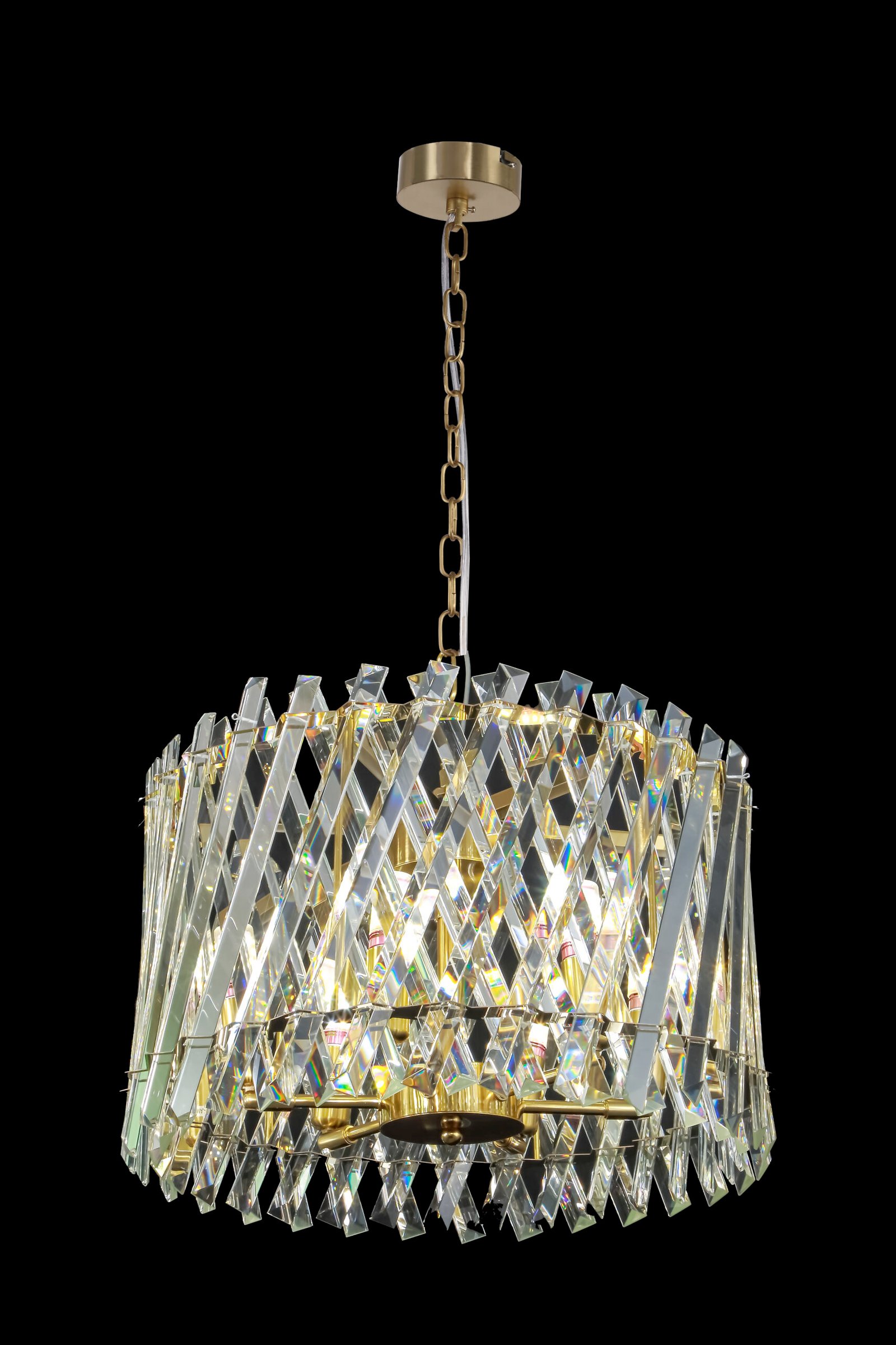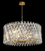 The Luxury Gold & Crystal Woven Drum Chandelier is an exquisite blend of craftsmanship and glamour. This statement piece features a golden metal frame adorned with intricately criss-crossed strands of precision-cut crystal prisms. The layered lattice design captures and scatters light beautifully, delivering a stunning radiant effect. Suspended from a matching gold ceiling canopy and chain, this chandelier is the perfect focal point for upscale dining rooms, lounges, or entryways.