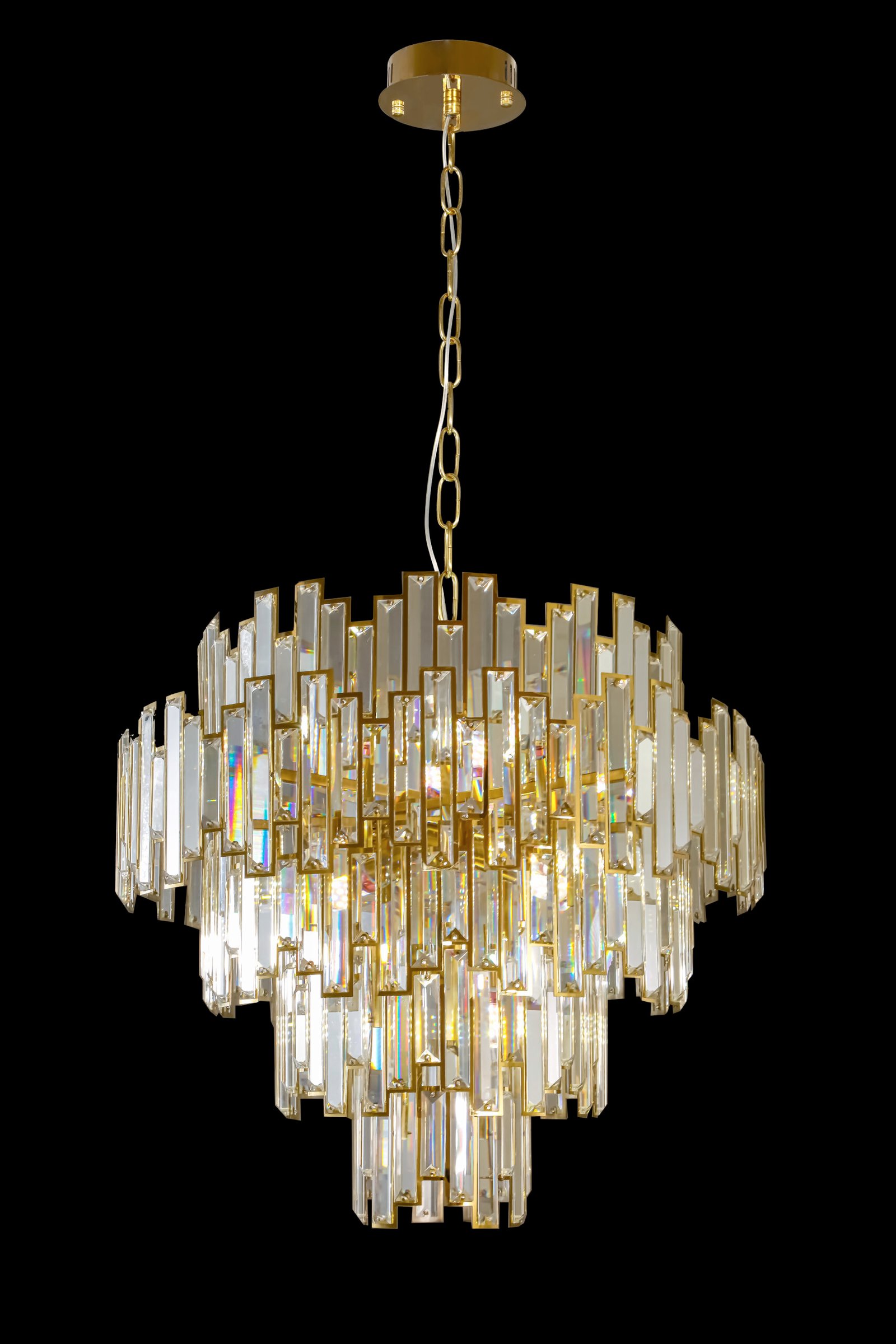 Make a bold statement of modern luxury with this chandelier. Designed with a stunning arrangement of rectangular precision-cut crystals set in a radiant gold frame, this piece dazzles with brilliance and elegance. The tiered layout adds depth and dimension, creating a breathtaking focal point in any room.